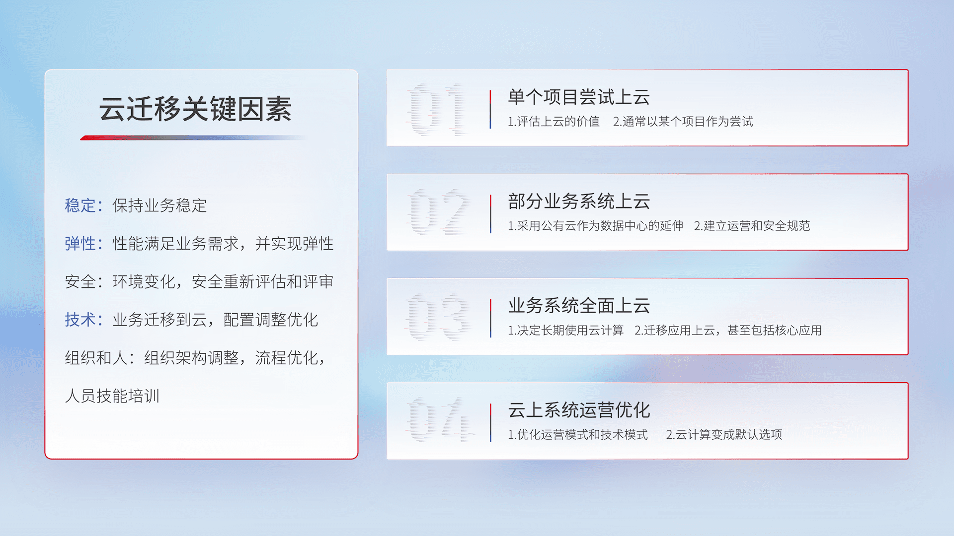 结合实际业务,,从规划设计、、、、云平台选型、、云原生改造、、数据迁移、、、、集成交付,,迁移全过程为客户识别最佳上云路径,,做好风险识别管理,,,设计网络架构、、身份权限、、安全审计合规、、、、操作审计、、日志审计、、、监控告警策略、、、多站点容灾设计等,,,,对云上基础设施进行整体规划,,,,提升IT治理水平,,,以满足弹性、、、、高可用、、、、高性能的需求。。。。