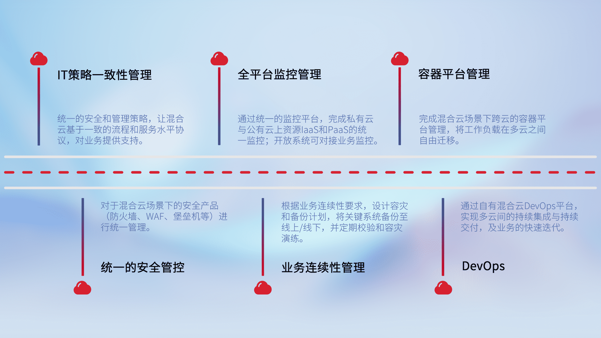 通过多云纳管,,以统一的资源数据模型把客户的云资源进行抽象和封装,,,进而实现对多云资源的统一操作,,,,保障云资源管理的可靠性、、稳定性与可用性。。量身定制化运维内容,,,,配置、、开发运维、、、、补丁管理、、、备份、、监控、、、认证和访问管理、、、、审计和日常巡检等,,,,保障在用云过程中的可靠度,,,稳定度以及高可用率。。