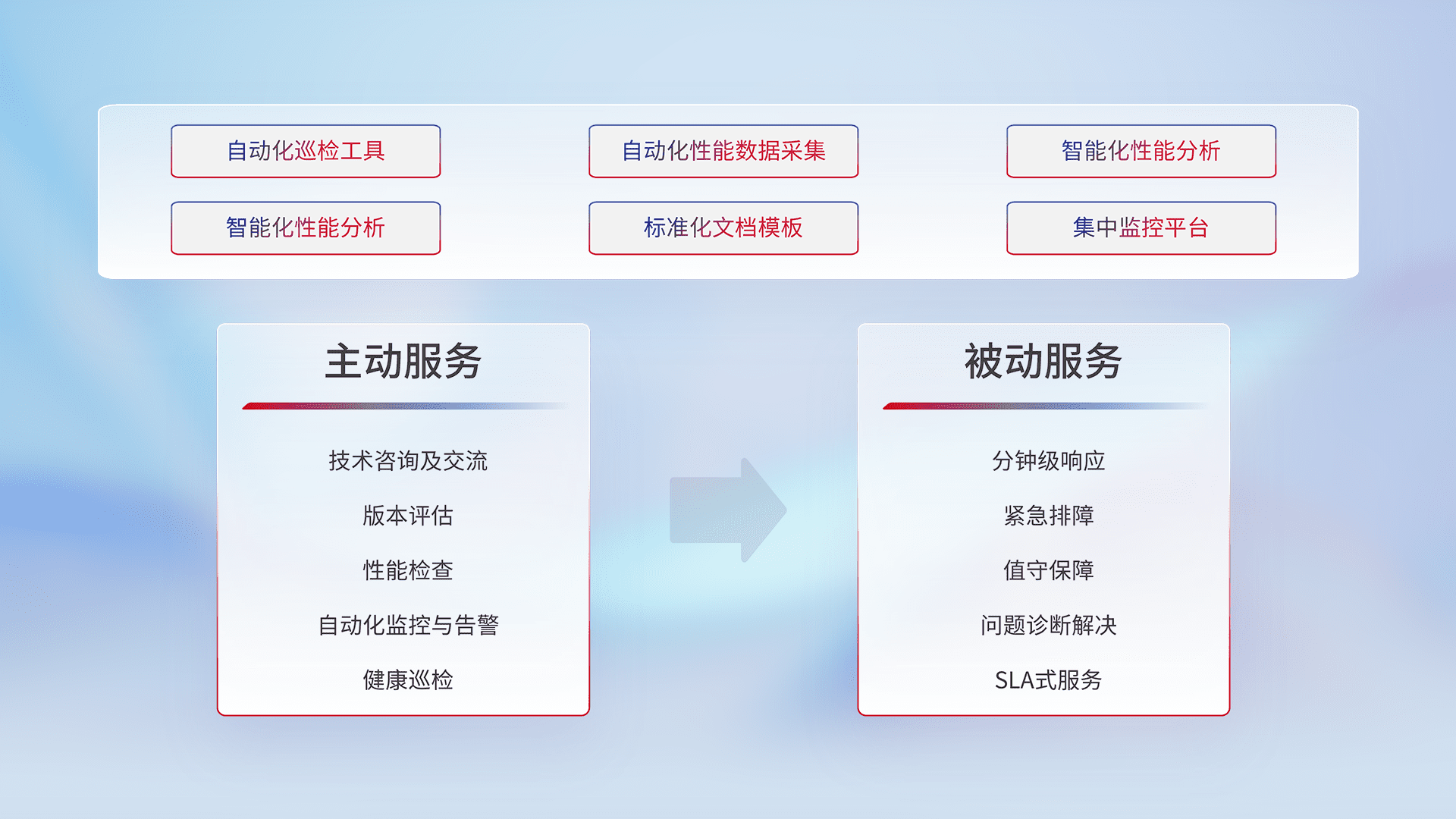 智能化工具和标准化文档,,,,保障服务质量,,,,提供主动服务(包含技术咨询、、、、版本评估、、、性能检查、、、、自动化监控与告警、、健康巡检)和被动服务包含(分钟级响应、、紧急排障、、、值守保障、、、问题诊断解决、、SLA服务)。。。